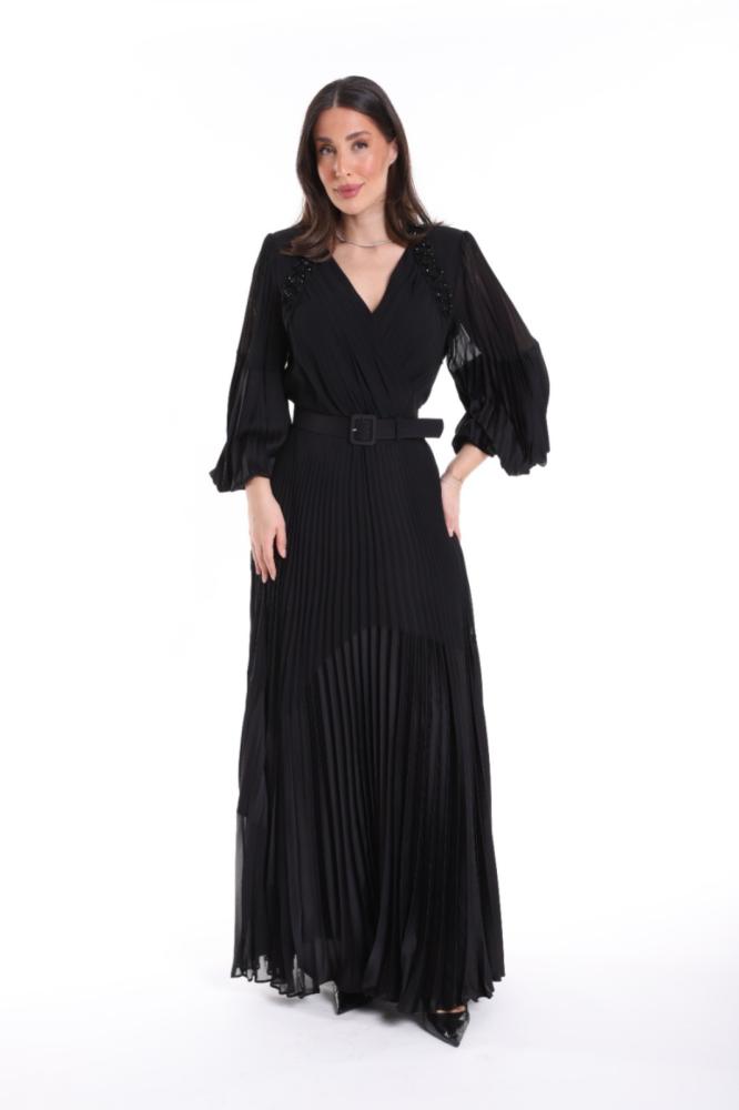 فستان راقي باللون الاسود من قماش الشيفون والساتان مزين بتطريز ناعم عند الاكتاف وبكسرات بيليسيهمقاس ٤٢ الوسط ٨٢ سممقاس ٤٤ الوسط ٨٦ سممقاس ٤٦ الوسط ٩٠ سممقاس ٤٨ الوسط. ٩٤ سم