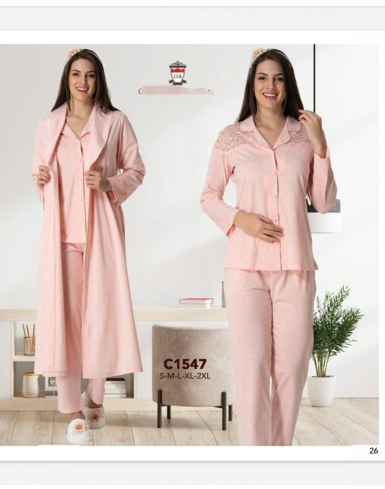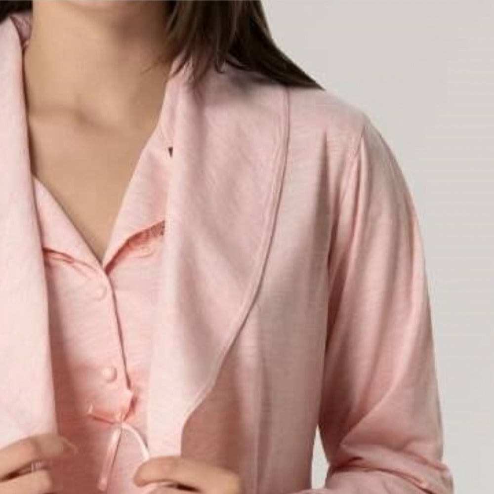 في استقبال النفاس والولادة اجعلي اطلالتك أنيقة ومريحة مع طقم استقبال الولادة من باهي فاشن مناسب لفترة الحمل والرضاعة باللون (الوردي صناعة تركية بنسيج من القطن الناعم مكون من قميص وبيجامة قطعتين وروب بأكمام طويلة مريح وعملي لفترة الحمل وما بعد الولادة ومناسب للرضاعة يمكنك ارتداؤه فيفي استقبال الولادة والنفاس سواء في المستشفى أو المنزل