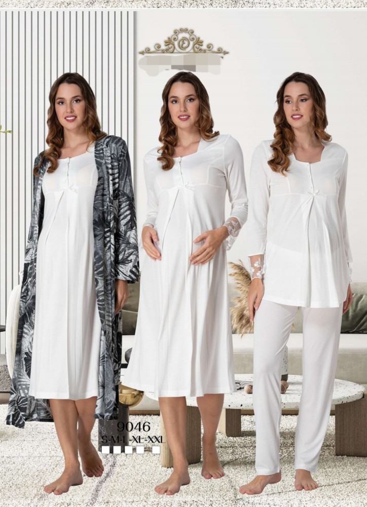 مكون من : بيجامة كم طويل وقميص كم طويل باللون الأبيض وروب مشجر ابيض واسود