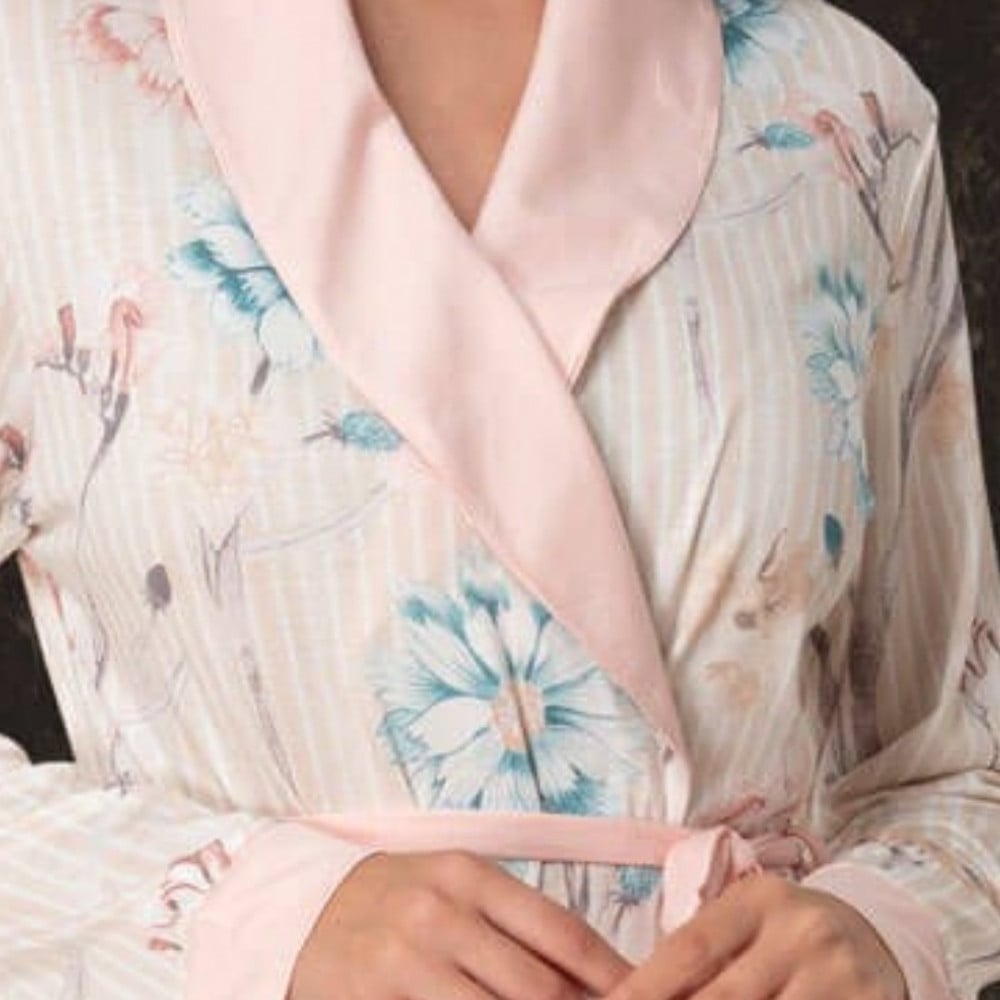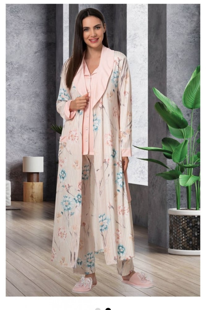 تتكون طقم بيجامة استقبال 3 قطع قميص سادة بأزرار امامية تسهل ارتداءها بعد الولادة والرضاعة الطبيعية . مشجر بألوان زاهية ومناسبة ، البنطلون مريح في اللبس ومناسب لفترة الحمل لأنه بخصر قابل للتعديل حسب فترة الحمل . وروب خارجي طويل مشجر بالوان زاهية مناسبة