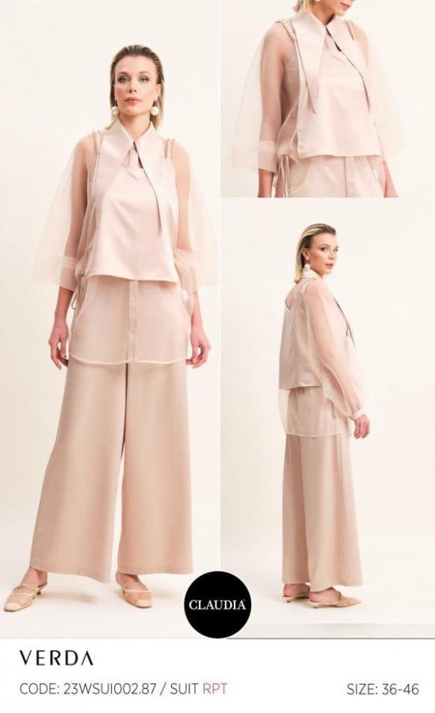 يتكون من بنطلون وتوب داخلي مزين بتطريز ناعم على الاكتاف وتوب خارجي كلها من قماش الساتان