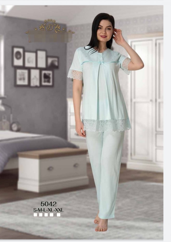 - عدد القطع : 4 قطع بيجامة قطعتين وقميص بأكمام قصيرة وروب بأكمام طويلة من القطن الناعم مزين بالدانتيل الراقي