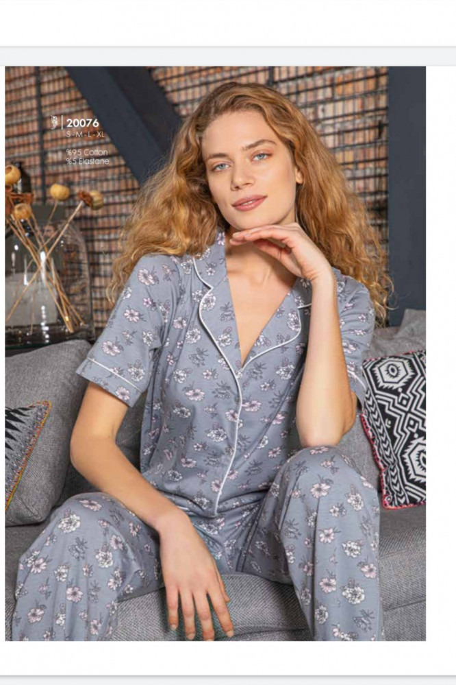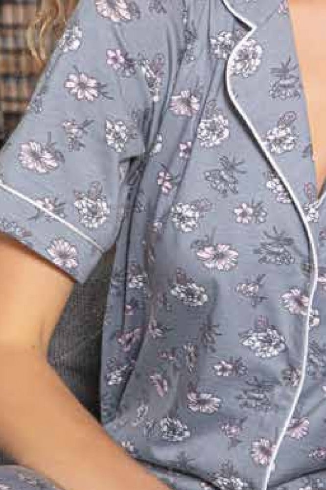 بيجامه صيفي صناعة تركية من قماش القطن بموديل البيجامه الكلاسك ذو الأزرار الأمامية باللون الرمادي المطبع برسومات ورود بيضاء