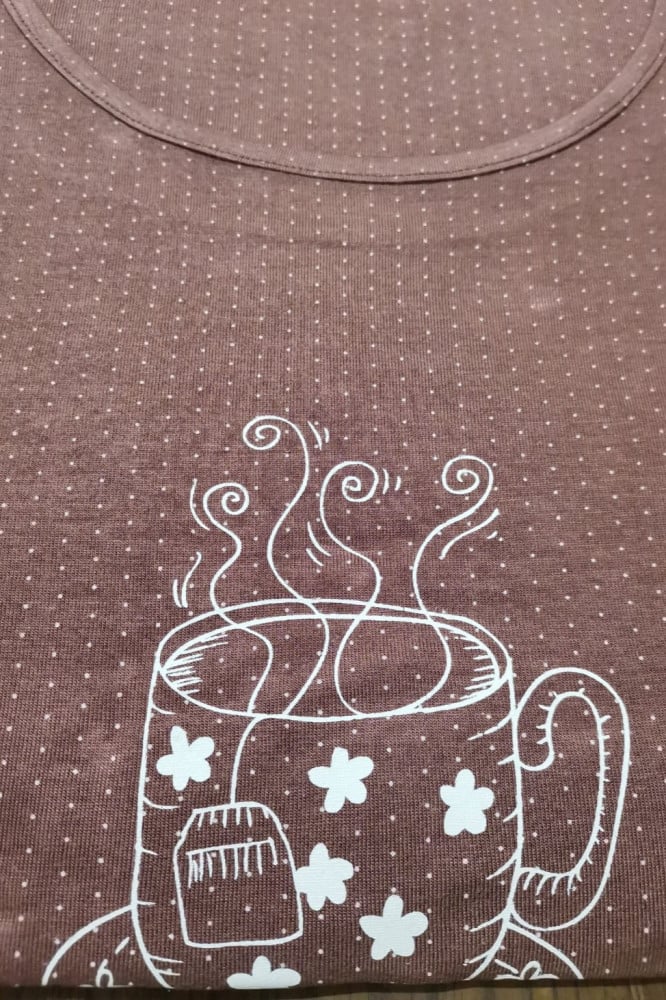 روب صيفي قصير صناعة تركية من قماش الفيسكوز الناعم بقصة انثوية ضيقة باللون الرماني الانبق مزين برسمة باللون الابيض