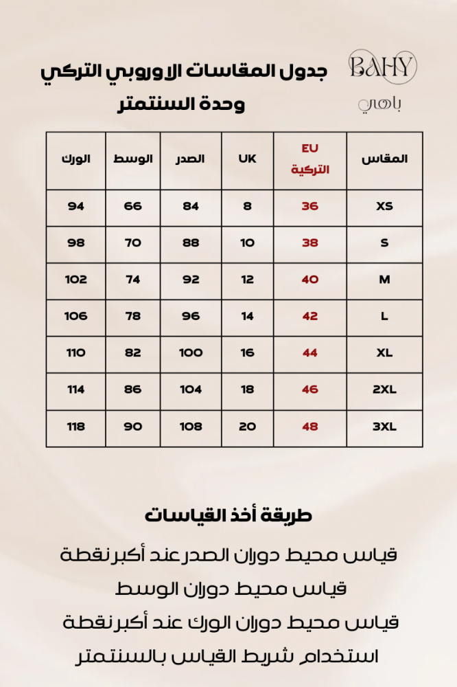 جدول المقاسات في الصور